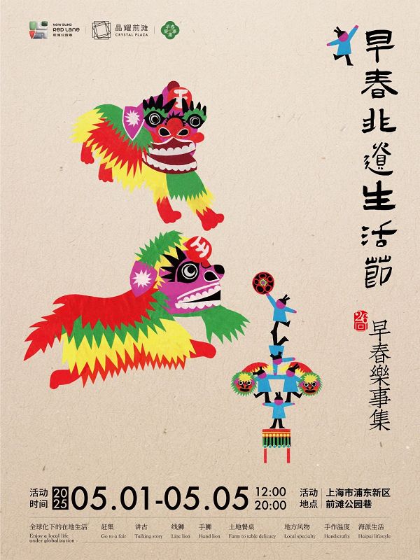 5月1日至5日,早春乐事集第26回、早春非遗生活节将在浦东新区前滩公园巷和晶耀前滩举办。早春乐事集是一个专注呈现全国各地非遗物产的市集,去年在上海举办的非遗手工节大受欢迎,这次在五一期间带来早春非遗生活节,以非遗手艺在生活中的创新呈现为主题,将有108位非遗创意人士参与。5月1日至4日,每天将有15:30、18:00、19:30三个时段,由福建宁德线狮少年队与上海马桥手狮舞队在前滩公园巷联袂呈现非遗剧场“线狮少年”。
