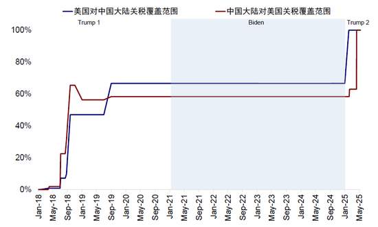 图表:中美双方对彼此关税覆盖范围维持在100%