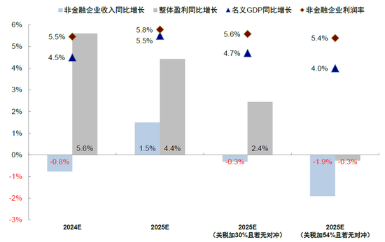 图表:54%的关税加征幅度对港股2025年盈利的拖累缩减至5ppt为零增长